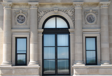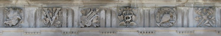 The stringcourse divides the first and second floors and features carved classical symbols and the letter “V” for Vanderbilt.